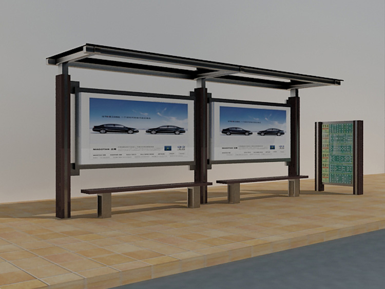 公交車候車亭一般是與公交站牌相配套的,為方便公交乘客候車時遮陽、防雨等,在車站、道路兩旁或綠化帶的港灣式公交停靠站上建設(shè)的交通設(shè)施。由于城市公交的日益發(fā)達,候車亭已發(fā)展成為城市一個不可或缺的重要組成部分,設(shè)計精美的候車亭也成為了城市一道美麗的風景。 一般候車亭棚體主要頂棚、立柱、頂弓、廣告燈箱和坐凳組成,也有用隔板來代替廣告燈箱的。